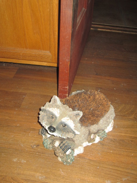 This morning I woke up after 6 a.m. When I came downstairs, I saw that the kitchen door was closed. The kitchen door is always open, held open by Vladimir. We bought Vladimir at a yard sale years ago, when JJ was younger. We decided to name it because it was cute. JJ asked, “So what should we name him?” I replied, “Let’s not name him a typical raccoon name like ‘Bandit’ or ‘Rocky.’ Let’s name him…..uhm, Vladimir because no one ever thinks to name a raccoon Vladimir.” So Vladimir he became. Vladimir’s cuteness is deceiving because he is actually very vicious and terrorizes us. He lurks near the kitchen door and occasionally attacks us as we walk by. Most people would say we simply stub our toes on him, but we know better. He rushes out and attacks when we least expect it. We then do a dance of pain, crying, “OUCH, OUCH, Vladimir just bit me again!” We should move him–and EJ has threatened to get rid of him–but Vladimir doesn’t bite all the time and he has become a permanent part of our home. What would we do without him to add a bit of excitement (and pain) to our lives? “He’s like Cato in the old Pink Panther movies,” I tell EJ. “He keeps us on our toes by attacking us unexepectedly.” (In the Pink Panther movies, Cato was a servant who was instructed to attack Clouseau unexpectedly to keep Clouseau’s combat skills and vigilance sharp. Cato often took these instructions to the point of ambushing Clouseau in his own house or at times when Clouseau obviously would prefer not to be disturbed.) Vladimir hasn’t attacked any of us in quite some time, but he attacked me yesterday. “OUCH, OUCH, Vladimir just bit me again! Stupid, stupid Vladimir!” I howled as I danced in pain.