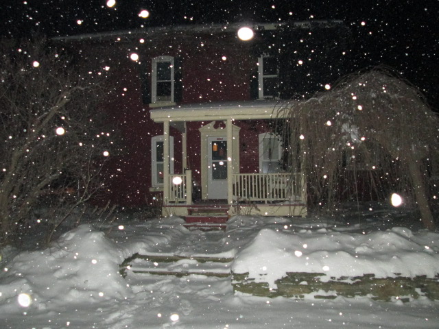 Afterwards, EJ and I went for a snow walk. We walked to the little store I went to this morning. We love walking in snow storms and ice storms and wind. The snow is coming down fast and heavy. The sidewalk that our neighbor plowed a few hours ago already has four inches of snow on it. I took my camera with us and took pictures. The pictures don’t really show how hard it is snowing. We had lots of fun on our walk.
