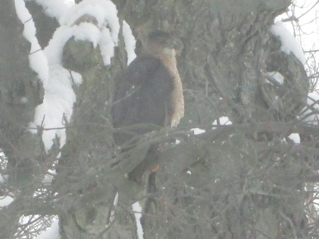Yesterday we had a relatively quiet morning. Well, except for the hawk. It twice tried to catch its breakfast at our bird feeder. The birds all were in a panic to get away and some of them sort of hit the window. The second time I saw the hawk sitting on the branch of a nearby camera. I grabbed my camera and was able to take one picture before it flew away. We googled the hawk to learn what kind it is, and our best guess is that it is a female Cooper’s hawk. I don’t like the hawk eating our song birds, but the hawk has to eat too and it sure is beautiful.