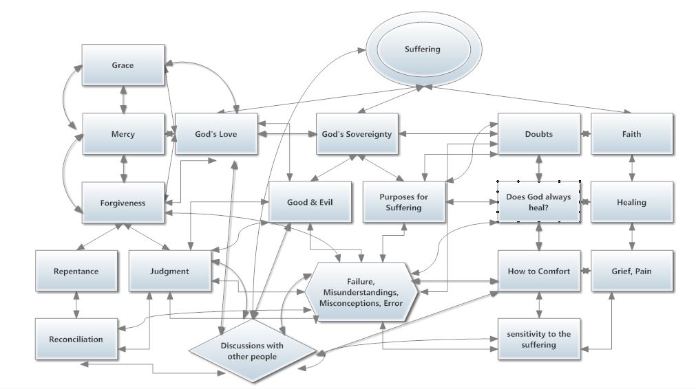 I made a very simplified chart to illustrate how my brain sort of works. You can click on the picture to make it bigger. I used the subject of suffering as an illustration because I tried to write about it so recently, but my brain works like this no matter what the topic. Sometimes I get a headache and wish I could turn off the thoughts like a faucet. However, I can’t turn them off, and actually, most of the time, I am glad that my brain ponders.