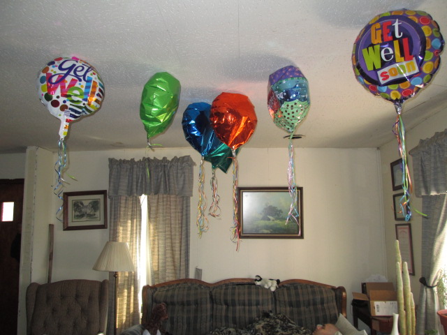 After JJ’s surgery, my friend had a bouquet of balloons delivered to his room. The balloons were attached to a stuffed kitten by ribbons. We brought them home with us but noticed that Luke was chewing on the ribbons so the other day I cut the ribbons from the stuffed kitten and let them float near the ceiling out of Luke’s reach. It’s of fun seeing all those balloons all over the living room ceiling–like a floating forest. EJ and JJ think they look like colorful jellyfish.