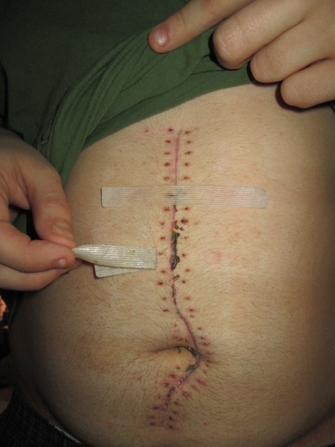 Also, JJ’s incision is healing. I asked to see it today, and thought it was interesting that I could see little dots where the staples had been. I wonder if the dots will form scars too? When JJ went to get his staples pulled out, the doctor said that the nurse would put a row of surgical tape across the incision and he should just leave the pieces of tape on until they fell off. He has only two pieces of tape left. He pulled on one while I took the picture and I said, “UGH! STOP IT!”