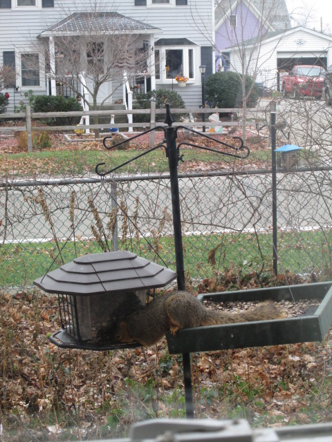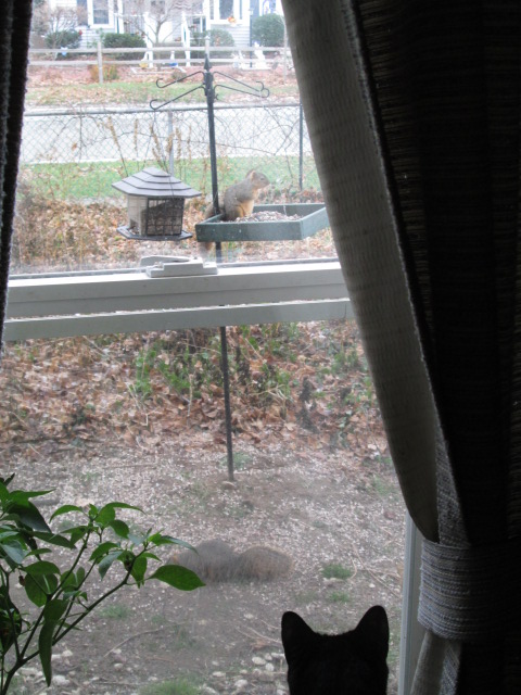 I enjoyed a few hours of quiet this morning while my guys slept. I made a pot of coffee, browsed my favorite places on my laptop, cuddled some cats, and watched the squirrel sit in the tray feeder while he ate sunflower seeds from another. When I went to the window to take this picture, I saw another squirrel eating seeds from the ground. Then I noticed a third squirrel heading toward the feeders. They were all very big and super fat–as if God had photo-shopped them. It’s probably because they have been feasting at our feeders. I know there are people who get upset when the squirrels eat from the feeders, but I enjoy watching all the wildlife that comes into our yard. Little Bear enjoys them too.