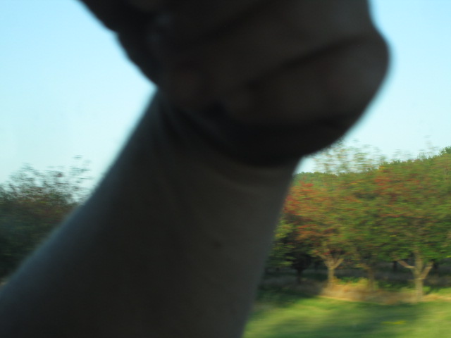 So we got in the car and continued driving…and driving…and driving.  We drove through miles and miles of orchards with trees drooping with red cherries. One cherry orchard was filled with trees so red with cherries that it looked like a forest of maple trees blazing with autumn color. EJ happened to lift his arm just as I snapped a picture of the orchard. Rats!