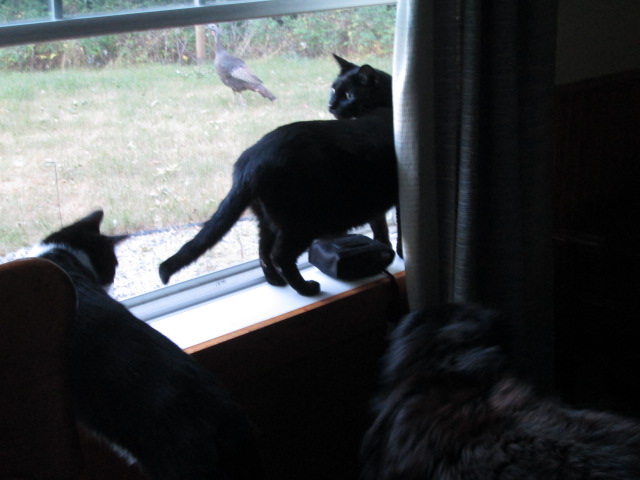 I was busy all this afternoon cleaning and finding places for the items I unpacked from a few more boxes. I was finally sitting down to rest when I happened to notice Little Bear and Timmy sitting on the window sill, very focused on something. They were looking down so I thought they had found a bug or something. Then Danny went over to the window and I could tell he was also interested in the “Something.” I decided to see what was so interesting and was surprised to see turkeys right outside the window!