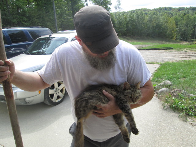 This morning EJ and I walked down to the mailbox. We saw deer tracks near the bottom of the driveway, but none so close that a buck would have wanted to warn me off. EJ said that it’s likely the deer crossed the driveway and then headed up the grassy hill where they’d leave no footprints. Danny walked down to get the mail with us…and our cat Tesla followed behind. We always have quite a parade–both human and animal–whenever we go get the mail. I stayed away from the road with the animals while EJ went to the mailbox. On the way back, he picked up Tesla and carried her up the driveway, as he often does. Tesla is getting quite old but she still follows us around.