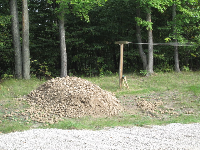 Late Sunday afternoon the younger Gravel Guy and his wife delivered a trailer filled with potato stones. Potato stones are rocks that are about the same size and shape as potatoes. They are great for allowing water to drain through them without causing erosion. I think it’s really funny that mixed in with our load of potato stones are real potatoes. I have no idea why. Each afternoon this week I have gone out and sorted through the potatoes/stones, tossing the potatoes to the side and putting the stones in the wheelbarrow to dump along the sides of the driveway. Since the forecast isn’t predicting rain anytime soon, I have been taking it easy–only taking a few loads of stones down the driveway each day. EJ and I can work harder during the weekend when he doesn’t have to work.