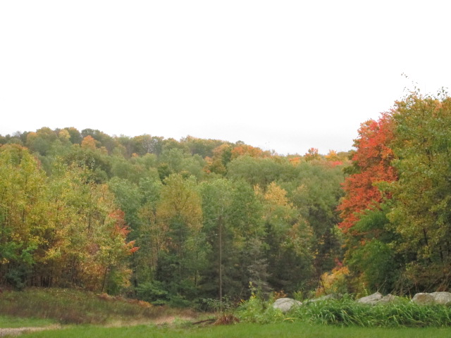 The meteorologists are saying that the color peak will occur in a few days. Already the leaves are beginning to fall. We can see the red roof of the neighbor’s house more clearly now. The red roof makes me think of Lincoln Logs cabins. I told EJ and JJ that we will have to plant evergreen trees at the bottom of the driveway so no one can see us even when the other trees lose their leaves. I like feeling safely hidden in our secret Enchanted Forest.