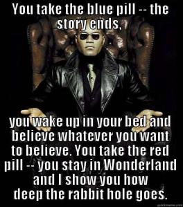 As I wrote the other day, I think that learning about abuse is sort of like the science fiction movie “The Matrix.” In the movie, Neo is offered a choice: He can take the blue pill which would allow him, like most others, to remain in the comfortable fantasy world of the Matrix. Or he could take the red pill which would show him the reality that most of humanity had been captured by a race of machines that lived off of the humans’ body heat and electrochemical energy and who imprison their minds within an artificial reality known as the Matrix. From birth to death humans existed in sort of embiotic sacks, plugged into the Matrix. They weren’t really living, they just thought they were.