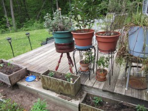 The peppers are in the three rectangular boxes. Left to right in the pots on the deck are sage, bay, rosemary, and my spider plant. The little pots have unidentified flowers in them that a friend gave us.