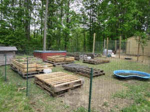 Each time I dragged a pallet into the pen, the ducks eagerly explored it for insects. I dragged ten pallets into the pen, stacked them two-by-two, so I have five additional surfaces ready for boxes/pots.