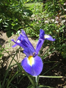 This morning I glanced out the kitchen window and was surprised by a breathtakingly beautiful iris in our flower garden. The flower garden was planted by a previous owners and we are often surprised by what unexpectedly appears. We also are overjoyed that some flowers that we love were already here when we moved. For example, EJ always wanted climbing rose bushes. We tried to plant some at our old house but our yard was very shady so, while we did get roses, they didn’t grow as well as we hoped. We found climbing roses waiting for us when we moved into our new home and they are growing beautifully in the sunshine. At our old house, we did have a beautiful lilac bush. I love lilacs (so does EJ) and I was sad to leave it behind. Our new home doesn’t have a lilac bush–it has THREE. They are light, medium, and dark lavender. I love them! Usually I cut bouquets of lilacs and put them in vases in the house. Their fragrance is heavenly! But this year our noses were all stuffed up with our bad colds and we couldn’t smell anything so I didn’t bother cutting bouquets.