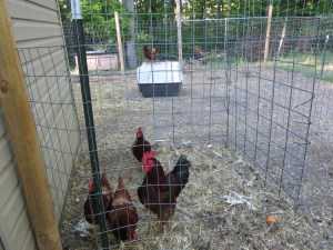 A few weeks ago I read that chickens do a tremendous job breaking down a compose pile. We can throw whatever into the compose pile and the chickens will eat what they want and scratch up the rest. Sounded good, so I made a small enclosure with pieces of cattle panels in the back corner of the chicken pen near the right side of the garage. The holes of chicken panels are large and the chickens went through them and scattered the scraps I threw into it all over the pen. So today I fastened chicken wire fencing to the cattle panels so the chickens can only enter/exit through the door way. I’m hoping it will cut down on the scattering. The chickens are cute because they have quickly learned that when they see me come around the right side of the garage I have possibly yummy things to eat. They all come running to the compost enclosure and wait for me.