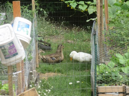 The ducks’ pen has two sections–one near the coop and the large portion enclosing the garden. This morning I shut the younger ducks in the garden section and kept Esther in the coop section. Esther is an older duck who is lame. Her previous owner (my sister-in-law) told me that she was crippled because the males liked her so very much. She is our Cuddles’ favorite and he is always on her. I often suspect Esther hides so Cuddles will leave her alone. This might be “too much information” but I’ve learned that when ducks have sex, the male gets on top of the female, grabs hold of her head, and does his business. Sometimes they do it in the water–but they will do it anywhere. It’s sort of rough, and Esther’s head is bloody from Cuddle’s grabbing her neck. I thought she needs to have a rest so I plan to keep her separated, at least until she recovers a bit. Poor thing. Cuddles has four other females to satisfy him so he can leave Esther alone for a while.
