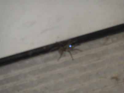 I showed my photo to EJ before he left for work. It isn’t a very good photo, but I wasn’t exactly going to go up to the spider and tell it, “Say Cheese!” while I took a portrait. EJ said, “Why is the spider shining a light?” Of course, it was obviously eye shine from the camera flash (or something), but I imagined it holding a spider-sized flashlight while it tried to pick the lock on the door.