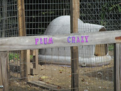 I used my purple paint pen to color the “Plum Crazy” letters. Then I turned the letters upside-down and painted the back with blue paint. Some of the blue paint got onto the front side, which I think gives the letters a wonderful “plum crazy” look. When I finished with the letters, I glued them to the gate leading into the poultry pens.