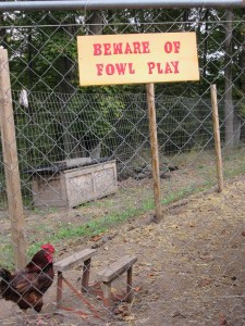 A couple of days ago I finished another sign. I love making these signs! I hung this sign on the fence dividing the chickens and the ducks. Cuddles, our male duck, liked to stand at the fence and pluck the feathers of any hen that came too close to the fence. Sassy the rooster would try to protect his flock by keeping himself between the fence and the hens, but sooner or later a hen would get within Cuddles’ reach. I finally fastened chicken wire on the fence so Cuddles couldn’t reach through, but he still waited by the fence, and Sassy still patrolled the fence and glared at him. I thought the “fowl play” sign was appropriate.