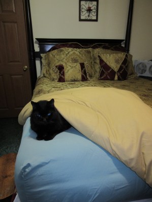 I always try to make the bed as soon as I wake up because the cats are more interested in getting their canned food treat and I can make the bed without them on it. But sometimes I’m late making the bed and I have to work around the cats. The photo shows how I make the bed when a cat is on it. Ha ha!