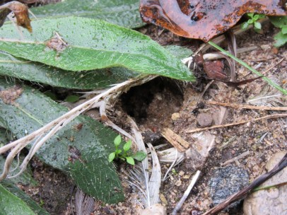 Yesterday I mentioned that Shelob, the huge wolf spider who lives in a burrow in the ground near the poultry pen, fills in the entrance to her lair when it rains. Yesterday afternoon I took a photo of her entrance. By then she had it so blocked in that it was difficult to even see that there was a hole. I kind of wonder if she pulled the green leaf over her lair to also help block the rain. She is clever. I haven’t seen Shelob for at least a month, but observing her lair get blocked and unblocked tells me that she is still alive. I always assumed that all spiders died off in cold weather, but I looked it up and learned from one website that: