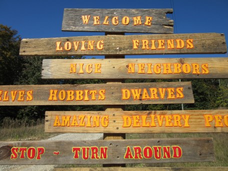 I dragged our stepladder down the hill and set it up next to my sign so I could reach the higher-up boards. I spent a happy hour or two outlining the yellow letters with orange paint pens. The orange looks good, but I don’t think it’s dark enough to be seen from a distance so I will probably re-outline the letters in red as soon as I can get to Joann’s Fabrics to buy a red paint pen.
