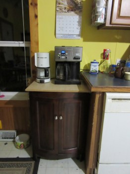 After our eye exams, we stopped at the Habitat for Humanity Resale Shop because EJ wanted to check it out. We weren’t planning to buy anything but then I found a beautiful small cabinet for only $15. I think its original purpose was to hold the bathroom sink but I thought it would be perfect to use as our coffee cabinet–with the coffee machines on top and the coffee supplies inside. EJ agreed. It’s much better than the tv tray we had been using. The cabinet didn’t have a sink or a counter on top, but EJ made a temporary counter and he will make a more permanent one later.