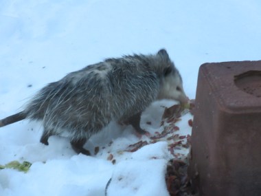 Late yesterday afternoon–I think at about 5 p.m., more or less–I happened to glance out the living room window and saw a large possum eating the vegetable peelings I had thrown out there for the deer. It probably wasn’t a good idea to throw the veggies out there since it could attract critters like possums, raccoons, and skunks, but I thought the deer would eat them. They didn’t. Oh, well, live and learn. Besides, it was also eating the seeds that had fallen from the birdfeeder. The possum went under the deck but we saw it periodically throughout the evening.