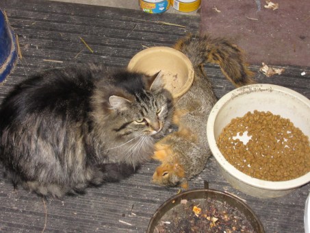 Every afternoon I clean out the litter boxes–both in the house and in the garage. I swear that half of my day is spent caring for animals. Not that I mind. Yesterday I took my bucket out to the garage, scooped out the clumps in the litter box, turned around, and was scared half to death by the sight of Miss Madeline Meadows’ latest kill. She always brings her kills into the garage and puts them on the mat near her food bowl. I’m getting used to the various mice, voles, and shrews that she leaves there, but I was completely startled to find a large Fox Squirrel. Squirrels are quick and I’ve heard that they can be vicious fighters so I have no idea how Madeline managed to kill one. And it must have been quite a feat carrying the body into the garage when it’s almost as large as she is.