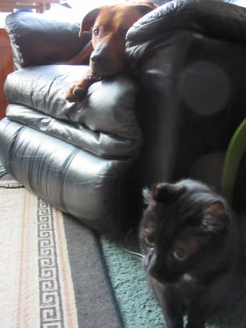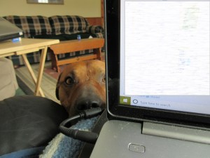 This afternoon Hannah wanted outside–for the millionth time. Sometimes I suspect that she wants out only so she can get a treat. I’m trying to teach her to walk with me and to go to the porch on command, and she gets treats for doing so. If Hannah wants out too many times, I start telling her “No, no, I’m not taking you outside!” but she can be very insistent. She starts by sitting next to my floor staring at me and make low grunts, and eventually gets into my lap where I can’t ignore her.