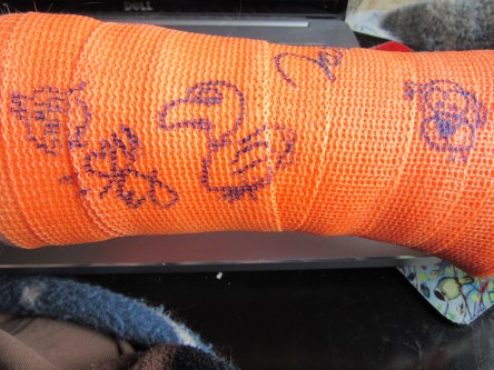 I hate this cast, although it is a pretty color and both EJ and JJ signed it last night. EJ even drew cute cartoon animals on it. But I never knew how rigid, sweaty, itchy, and uncomfortable a cast could be. I am trying very hard to imagine my cast being like Wonder Woman’s golden bracelets, which can repel bullets, but although my cast does repel threatening dog and cat claws, my arm seems to have a mind and an imagination of its own. My arm feels imprisoned and claustrophobic and it wants to growl and smash the cast off like the Hulk breaking out of restraints. I have to keep calming my arm down, encouraging it to patiently endure and not smash itself out of the cast. I keep telling myself, “Be Wonder Woman, not the Hulk.” Only two weeks. I can do this. GRRRRR
