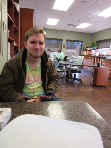I remembered to take a photo of my physical therapy room yesterday. In the background, my therapist is working with a guy while I’m sitting at a small table with my hand/arm wrapped in warm towels for 15 minutes to warm up the ligaments before I go to the table for my session with her. JJ thought I was taking a photo of him so he pretended to frown, but I said, “No, I’m trying to take a photo of the towels–and the room.”