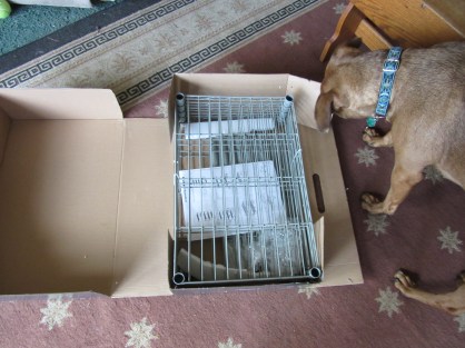 Thursday afternoon my shelves were delivered. I put them together with Hannah’s help. She sat next to me…and ate plastic pieces from the box. The first time I saw her eating something…I gasped in dismay. The second time, I pried open her jaws…which wasn’t easy. Then I realized she was only eating the spacers used to separate and protect the shelves during shipping. I tried to keep the pieces safe from her but she almost got a fastener I needed. At last, however, even with Hannah’s distraction, I got the shelves together and in the closet in our library.