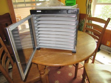 I used an old pair of scissors that we use to cut open everything and slit the packing tap and opened the shipping box. I then had to wrestle the box that the dehydrator is packaged in out. I finally got the box out of the box, and then wrestled the dehydrator out and heaved it (again gently) onto the kitchen table. Whoa….it is big. It is almost as large as the table. I wiped down the ten racks as the booklet instructs and slid them into the dehydrator. I am all set to go now!