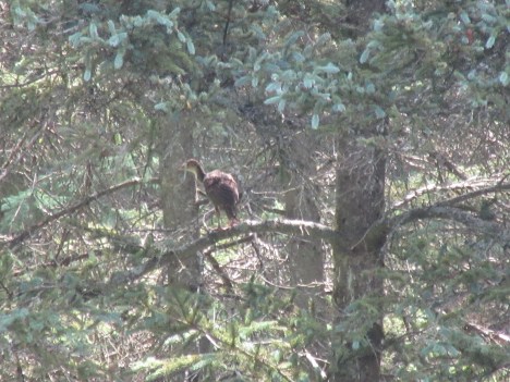 I was tired and sweaty from all the heaving, and pulling, and opening, so I sat in my chair to recover. However, Hannah decided that she wanted to go outside. She doesn’t take “no” for an answer, and she will grumble, growl, put her nose in my face, and nudge my computer aside until I take her out. With a sigh, I got up, put her harness and leash on, and off we went. I took a long my camera so I could take a simple picture of The Magic Box for this blog post. Part way down the hill, however, the Hannah and I and the turkey family surprised each other. The Mama turkey squawked a command and all the babies flew up to the trees for safety while the Mama scolded us from the ground. I had my camera in my hand, but the sight of the babies flying up in formation like the Air Force Thunderbirds was so magical that I just stood there enthralled, camera forgotten. Once in the trees, the babies were very difficult to see–and the Mama was alarmed and Hannah was trying to pull me over to her–but I did manage to get one photo: