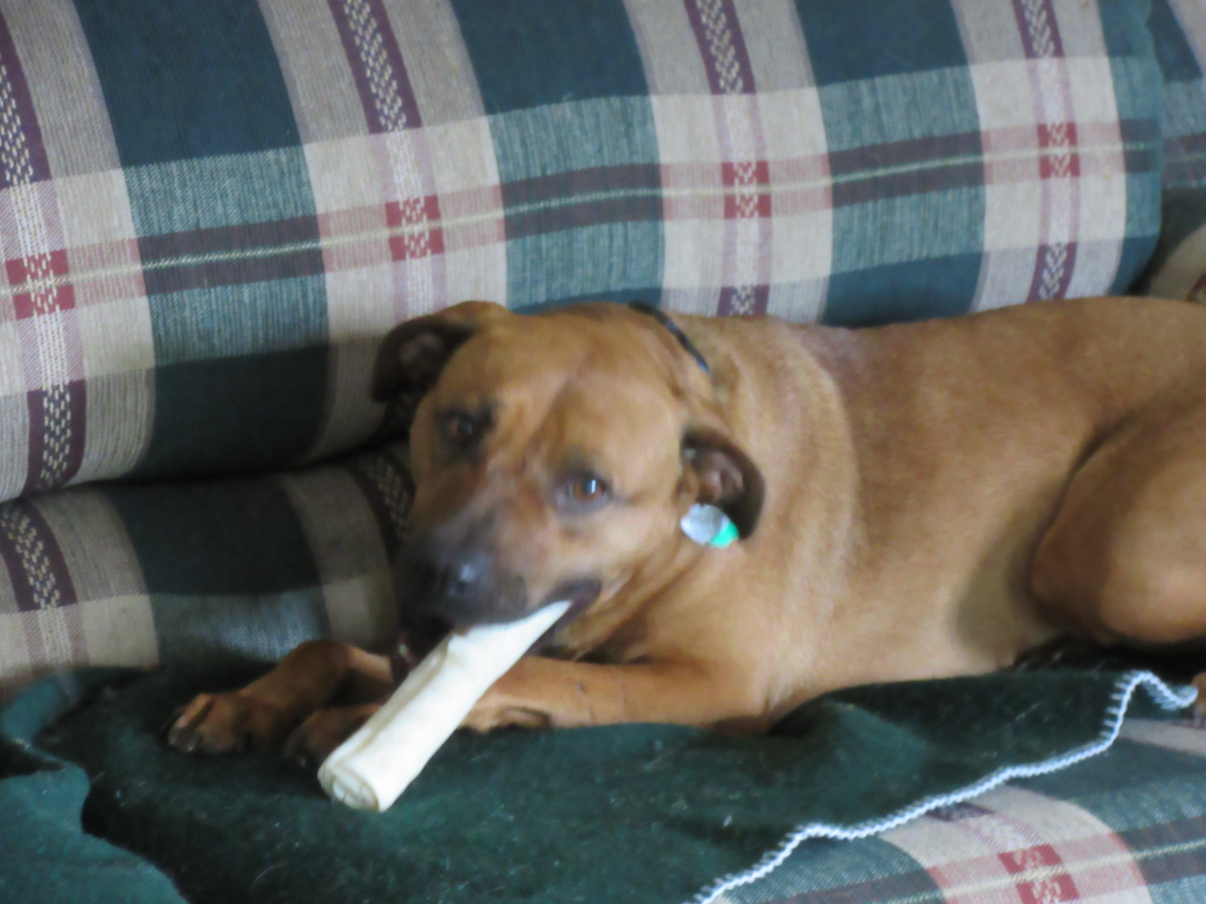 I gave Hannah her bone. We have bought her balls and ropes, but this is the first time we bought her a rawhide bone. We were curious to see how she would react. Oh, my goodness! She was ecstatic! She gnawed on it nonstop for at least 3 hours. EJ’s long-time friend TH came for a visit. We call him “Hannah’s favorite uncle” because when he met her on his last visit and made friends with her, she wouldn’t leave his side. When she heard him come through the door today, she carried her bone to see who it was, and then she growled at him as if afraid that he had come to steal her bone. Since I sometimes try to take paper towels away from her, she didn’t trust me either and kept turning her back on me if I got too close. We all kept telling her that none of us wanted to take her bone. For the rest of the visit, Hannah totally ignored her favorite Uncle in favor of her bone. I think I will give Hannah a bone whenever we need to leave her at home. Maybe it will keep her occupied and out of trouble.