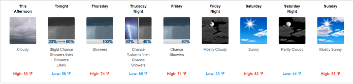 It is a cloudy and cool 63 (F) degrees today, but I felt very warm as I worked. I think the humidity, which is at 69% today–I remembered to check–makes the coolness feel warmer. Later we are supposed to get some rain, and it will rain for the next few days. This is our forecast from the National Weather Service. As you can see, the days and nights are getting cooler.