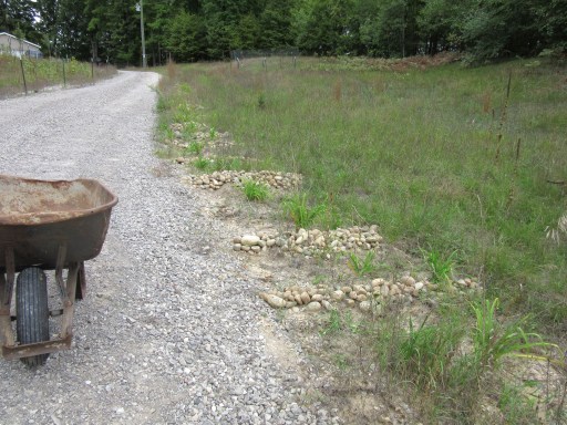 I’ve been working on my rock dams this week. My goal is to take one wheelbarrow load–a light load–of potato stones down the driveway to rebuild the dams to stop erosion. Yesterday I actually did two loads. Today I didn’t want to do any but I forced myself to do one load. I started at the top of the driveway and I’m working my way down. I figure that it’s best to start at the top in order to slow the speed of the rainwater rushing down the hill. I figure that I’m about halfway down the driveway now. I thought I was halfway down the driveway yesterday too so it doesn’t feel like I’ve made much progress but I sort of suspect it’s like driving toward mountains that never seem to get closer even though they are. I was sort of hoping I could complete the dams before it begins to rain, although I had no desire to push myself hard. I figured I would get done what I get done, and any improvement is better than none.