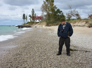 We drove to the shore at Frankfort to take a photo of its lighthouse, and then we headed back north. We stopped at Point Betsy Lighthouse to go rockhounding. At Sleeping Bear Dunes we were high above Lake Michigan, on top of very steep dunes, but at Point Betsy we were able to walk along the shore at the water’s edge. We’ve been to Point Betsy several times before, but only on calm, sunny days. It was fun being there on a day when the waves were higher and came crashing to shore. I thought they were beautiful, and very mesmerizing. As we were crossing around some large boulders to continue down the beach, we got caught by some higher waves. My shoes and pant legs were drenched. We found a few pretty rocks, but didn’t want to get too close to the water to find more. We both agreed we would like to visit Lake Michigan on a stormy day to watch even higher waves.