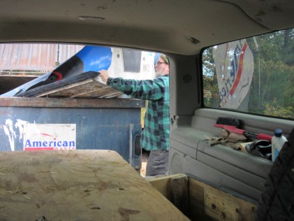 I forgot to mention yesterday that before we headed off to the feed store, EJ loaded the old living room carpet into the Suburban. It had been lying next to the garage ever since we tore it out last summer in preparation to getting new flooring. We’ve wanted to get rid of it since we tore it out, but we’ve been busy the last few months and other tasks had higher priority. We drove the carpet to EJ’s company and threw it in the dumpster. His company lets employees discard personal stuff in the dumpsters for free.  Today EJ put a small dingy in the Sub and we took that to the company dumpster as well.
