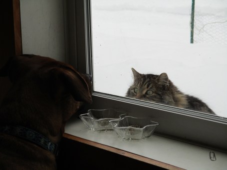 Yesterday I saw Hannah Joy and Miss Madeline Meadows looking at each other through the window. Madeline prefers being an outside cat. but don’t worry, she has a nice warm house in the garage. She is such a good huntress that I call her our serial killer cat. I wondered if she was plotting against Hannah.
