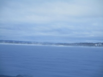 EJ works four 10-hour shifts at work so he gets Friday, Saturday, and Sundays off. We had errands to run in Traverse City today, so we walked down the driveway to the Xterra and drove off. The wind blowing the snow across the frozen bay was beautiful.