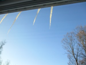 We’ve been having days of snow alternating with days of sunshine. Sometimes the temperatures warm up and cause the snow on the roof to melt and drip. Then the temps get low and re-freezes everything. I took this photo of icicles hanging from the roof like sharp fangs. Last night the temps plunged to -3(F) degrees. Brrr. It’s hard to believe that the southern parts of the USA are warming up and getting hot.