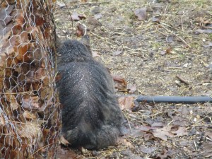 Sunday afternoon I spotted Miss Madeline Meadows, our sweet serial killer cat, trotting past the windows with a large chipmunk in her mouth. I am glad when she kills mice, voles, moles, and shrews, but I hate when she kills anything else. I figured the chipmunk was dead, but EJ suddenly exclaimed that it had escaped so I ran out to distract Madeline so the chipmunk would have time to get to safety. At first I couldn’t see either the cat or the chipmunk, but then I spied Madeline sitting not far away (with no chipmunk) on a fallen tree. With her coloring, she blends right in with the forest trees and dead leaves. Yesterday I found the bodies of two rodents–one inside the garage and one just outside the garage. I couldn’t tell if they were mice or shrews, but I didn’t mind that she had killed them. Mice carry disease and I’ve read that they will nibble off the toes of chickens while they sleep at night. And shrews are venemous.