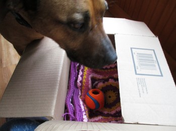 Hannah created her own twist on the game of Fetch. EJ often tries to vary how he throws the ball to her and Hannah varies how she brings it back. She doesn’t just place it in our hands. In fact, she grips it more tightly if we try to take it from her. She waits until we aren’t paying attention and then she hides it close to us. After she has hidden it, she sits a few feet away and stares at us expectantly. If we don’t notice her, she begins barking/growling at us to get our attention. Sometimes she has hidden it so closely that we can’t find it. When we ask her, “Where is your ball, Hannah?” she stares directly at it. If we still can’t find her ball, she gets it herself with a sigh. She has hidden the ball on either side of our chairs, on our laps or feet (how she gets it there without our knowledge, I’ll never know), under the coffee table between EJ and me, in the table drawer (in which I put the yarn of my current project), on the window sill. She recently put her ball in the box that I’ve been putting the completed squares of the afghan I’m working on in to keep them safe. I had to open the box to find the ball and take the photo.