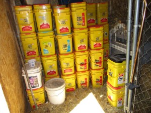 When we got home, EJ drove the Suburban around to the back and unloaded the bags into the coop. I have spent the last few days scooping the feed into empty kitty litter buckets. The buckets stack nicely and take up less room than the bags. We use litter buckets for just about everything. When I ran out of empty ones, I scrounged around in EJ’s garage for buckets holding various tools, nails, bolts, and other stuff. Whenever I found a Tidy Cats bucket with the lid still on, I emptied the contents into a smaller or lidless litter bucket. I did the same for buckets in the pantry that stored our wild bird seed or old bills and things. I was able to find enough buckets to fill about 45 buckets and store all but one bag of poultry feed. It’s actually a lot of work transferring a thousand pounds of feed into buckets.