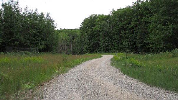 Before our neighbor drove off today, we gave him three dozen eggs. I had been wanting to give him eggs as a small thank you for snowblowing the driveway in the winter. Dale on his tractor returned a short time later. He had noticed that our driveway was lumpy and bumpy. We have found it impossible to smooth the driveway very well with just shovels and rakes. Dale had a grader on his tractor, and he drove up and down the driveway multiple times to smooth it out. Now it looks awesome! This is the photo I took this morning of our graded driveway! This year the plants are so thick that you can’t even see the rock dams in the photo.