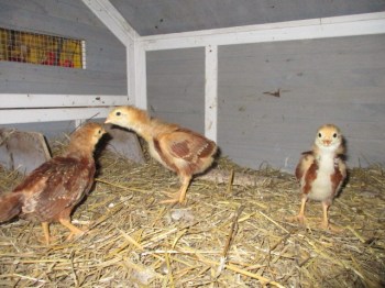 I opened the door to the second floor of the fancy coop and I was able to get a photo of three of the chicks who had climbed up there. They are getting larger in size and also sprouting more feathers.