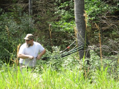 Some of our pine trees at the bottom of the driveway have died. EJ suspects pine bark beetles killed them. He’d like to eventually get (I think) Norway Spruce to replace them because the beetles don’t go after them. During a storm a few months ago, the wind caused one of the dead trees to tilt across the driveway. If it fell all the way over, which would happen sooner or later, it would fall across the driveway. We have been discussing how to move it out of the way. EJ couldn’t just pull the tree straight out of the way with the Suburban because he’d have to drive down a rather steep embankment–and I suppose there would be a risk of the tree dropping on the vehicle? We don’t have a chainsaw to cut it up. A chainsaw is on the long list of items that we really could use but can’t afford yet. We finally decided on a plan, and EJ decided to implement it early this afternoon.