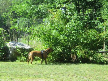 Saturday was our resting day. When we took Hannah Joy out in the early evening, EJ noticed that some of our raspberries were ripe. We have lots of bushes on our property, although the berries are small and usually the birds get to them before we do. EJ picked a few, eating a couple and giving a couple to me to enjoy. I gave one to Hannah. She really liked it. The next morning when I tied her outside, I spied her eating the berries from the bushes she could reach.