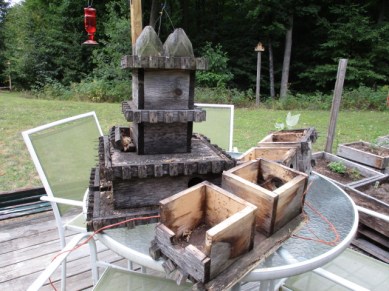 I went back through the berry bushes to the fallen castle. I thought about tying the twine around the castle to prevent it from sliding down further and to help me pull it up. However, I couldn’t find a good place on the castle to tie it to, so I didn’t use it. I was able to retrieve pieces of the castle, and then pry the base off with the shovel. I took the pieces to the patio table on the deck. The wood is decayed and I don’t think it can be saved. I am sad. I loved that castle. It added such an enchanting bit of whimsy to our forest. EJ says he can build another, but we have so many tasks that NEED to be done that I don’t think he will have time to build a castle.
