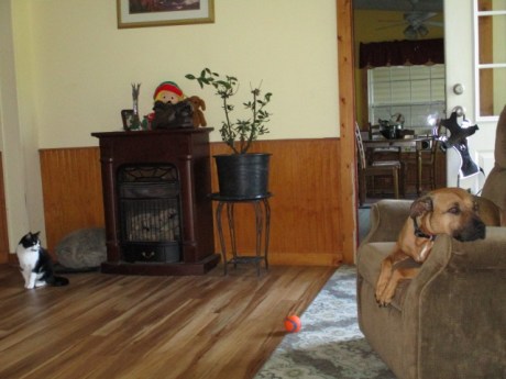 Do you see Hannah Joy in her chair and the cat to the left? The cat is Timmy. Hannah doesn’t like Timmy and will often bark sharply at him and chase him, especially if he gets too close to us. She never actually hurts the cat. I think Hannah is jealous of him. In the photo, Hannah looks like she’s not paying any attention to Timmy, but she is just pretending. In reality, she’s hyper-aware of him. I had told Hannah to “be nice” to Timmy, and she’s sort of sulking. She tries (somewhat) to resist the temptation of barking at him, but she always gives in and turns to bark briefly at him and then turning quickly away as if she didn’t bark at all and is totally innocent–as if we won’t notice or hear her if she does it quickly enough. Hannah is a hoot. LOL.